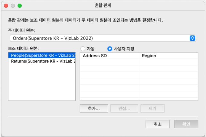 | [혼합 관계 편집]으로 블렌딩 조건 설정 | [Orders] Address SD = [People] Region 키 필드 확인 | |