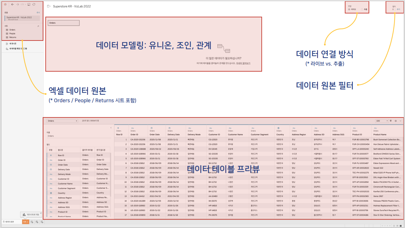 | Orders + People + Returns 시트 조인 결합 | [Orders] Address SD = [People] Region 키 필드 확인 | |