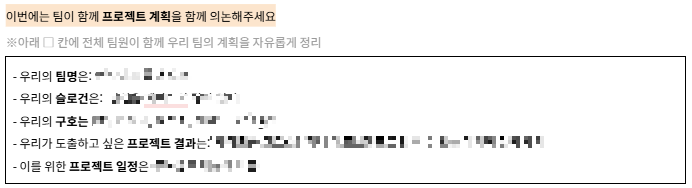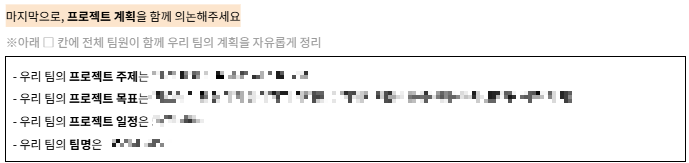 앞선 피어세션과 마찬가지로 질문이 적힌 문서가 공유되었고 하나하나 질문을 채우면서 서로에 대해서 알아 가는 시간을 가졌습니다. 2회차 피어세션 때는 첫 프로젝트라는 기대감과 앞으로 그 프로젝트를 함께할 동료들이라는 동질감에 설레이며 피어세션을 진행했던 것 같아요..! 자기소개 뿐만 아니라 한달간 진행한 부트캠프에 대한 소감과 프로젝트에 대해 자기가 생각한 방향성을 공유하며 그 내용들을 바탕으로 최종적으로 다함께 진행할 프로젝트 계획까지 미리 이야기를 나눌 수 있어 프로젝트를 시작할 때도 도움이 많이 되었습니다.