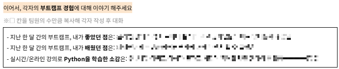 간단한 자기소개 및 본인이 데이터 분석에 관심을 갖게된 계기, 부트캠프에 지원한 이유와 추후에 하고 싶은 일 등 다양한 주제에 대한 이야기를 나눴습니다.