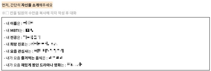 1회차가 정말 자유로운 분위기의 대화의 장이었다면 2회차부터는 프로젝트 워밍업을 위한 의무적인 과제 느낌이긴 했습니다. 물론 명확한 방향이 주어지고 그안에서 딥한 대화를 나누는 것도 좋았습니다. 앞으로 약 2주동안 프로젝트를 함께할 팀원들에 대해 미리 알아갈 수 있는 시간이 주어져서 팀원을 이해하는데에도 많은 도움이 되기도 했고요!