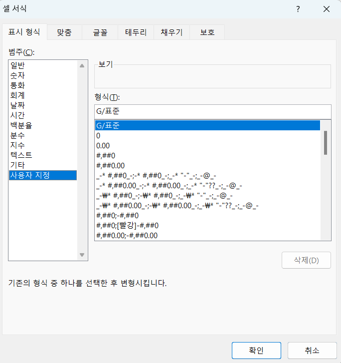- Ctrl + 1 눌러 표시형식 실행