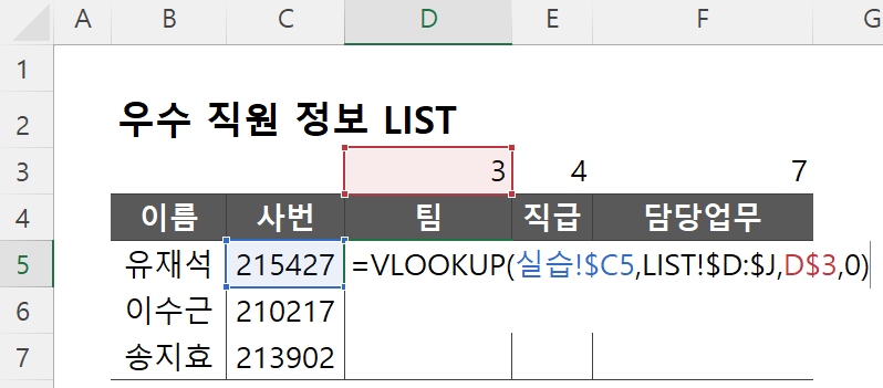 - 데이터 범위(LIST!$D:$J)에서 불러올 데이터들의 열 번호를 구한 값이 있는 행을 절대 참조 (D$3)